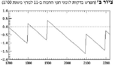 זאת ועוד, העובדה שהלוחות הנ"ל מבוססים על חישובי לוח ארבע-שנתי שנעשו כמעט לפני מאה שנה גורמת אי דיוק נוסף למשתמשים בהם בזמנינו. אי דיוק זה נגרם ע"י חוסר עדכון של לוח ארבע-שנתי אחרי משך זמן ארוך. הטעם לזה הוא שלוח הארבע-שנתי רק קירוב למחזור האמיתי של הלוח האזרחי. קירוב זה טוב רק לכמה עשרות שנים. בדרך כלל הלוח הארבע-שנתי שנתחשב בסביבות שנת המאה הקודמת מתקרב עוד פעם ללוח האזרחי האמיתי בשנת המאה הבאה ע"י אי תוספת של יום נוסף בפברואר (כמבואר להלן בציור ב'), משא"כ בשנים שבין 1900 ל2100, שבהם הלוח האזרחי האמיתי אינו מאבד יום על פי חוקיו עד שנת ה2100 ומטעם זה הסטייה בלוחות הנ"ל תגיע עד שתי דקות במשך הפחות קצת ממאתיים שנים שיעברו מזמן חישובם (ראה להלן ציור ב'). ואע"פ שהלוח של הרב נתנאל ושל הרב שפירא היו מחושבים בדיוק של רבע דקה, דיוק זה כמובן מאבד ממשמעותו כבר לאחר 24 שנים לאחר חישוב הלוח (בערך בשנת תר"פ בלוח של הר' נתנאל)! ברור שמטעם זה, אף אם היה מהווה את הסיבה היחידה לכך, כל הלוחות שנעשו בזמנו של הר' נתנאל, אינם יכולים בזמן הזה לשמש לזמני הנץ הנראה האמיתי.