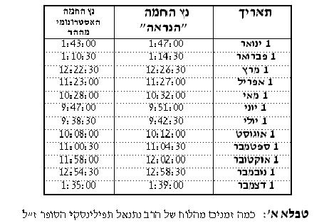 טבלה ב' דלהלן תוכיח שגם הרב משה שפירא השתמש בהפרש קבוע של שלש דקות הנ"ל לכל השנה לזמני הנץ החמה "הנראה" הואיל וזמני לוחו מוסיפים על הלוח של הרב טוקצינסקי הפרש קבוע של שתי דקות (בערך) בכל זמני היום. (אחרי שכתבתי דברים אלו ראיתי מכתב מהרב שריא דבליסקי שליט"א שכבת לאבריך חשוב שרב שפירא אמר לו בזמנו שהלוח שלו מבוסס על תוספת של ג' דקות קבועות לזמני הנץ המישורי למשך השנה.) מכאן יש ראיה ברורה שכל הלוחות האלו אינם מבוססים על תצפיות יום-יומיות שהרי האיחור של זמני הנץ החמה הנראה מזמני הנץ האסטרונומי (הנקרא נץ אמיתי ע"י ר' נתנאל) הוא משלוש דקות בחורף עד חמש דקות בקיץ (כדלעיל בציור א'). לכאורה הלוחות של הרב טוקצינסקי ושל הרב שפירא השתמשו בעיכוב המינימלי לנץ החמה הנגרם ע"י הרי מואב בחורף לכל השנה (והרב נתנאל השתמש באיחור הממוצע). על פי סברא אין טעם מוכרח מדוע יש להוסיף את זמן העיכוב המועט ביותר כקירוב לזמני נץ הנראה, ולא את זמן העיכוב הממוצע (כמו שכן עשה הרב נתנאל) או הגדול ביותר. ברור כי עקב הקירוב הנ"ל להחשיב את האופק המזרחי כאופק אחיד, נגרמו אי דיוקים בזמני הנץ החמה ברוב ימות השנה ואין להתחשב בהם כלוחות של נץ החמה הנראה ממש, במיוחד בלוח של הרב טוקצ'ינסקי, מפאת בעיות שנתעוררו בהמרת הלוח המקורי מהשעון הערבי לאירופאי. שהרי אותם זמנים שהוא הביא בשעון אירופי לא מתאימים לזמנים שהוא העתיק מהלוח של ר' נתנאל בשעון ערבי. אלא הם מקדימים בערך בשתי דקות ממה שהיה צריך לצאת מהחשבון האסטרונומי הידוע (הנקרא "שוויון של זמן") שמשתמשים בו כדי לתרגם משעון ערבי לשעון אירופאי. ובלי ספק זהו הפירוש להפרש של שתי דקות בכל זמני היום שבין הלוח שלו לבין הלוח של הרב שפירא המובא בטבלא ב'.
